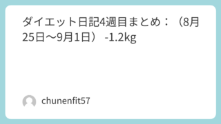 1週間まとめ ダイエット日記4週目まとめ:(8月25日~9月1日) -1.2kg 2025年8月25日~9月1日、57歳中年フィットおじさんのマンジャロダイエット4週目のまとめ。体重83.0kgで前週比-1.2kg、5mg転換と調整の記録。63kgを目指す。 2025.09.01 1週間まとめ