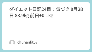 毎日の変化 ダイエット日記24目:気づき 8月28日 83.9kg 前日+0.1kg 2025年8月28日、57歳中年フィットおじさんがマンジャロで24日目。体重83.9kgで前日+0.1kg、マンジャロ効果と味覚変化に気づく。63kgを目指す。 2025.08.28 毎日の変化