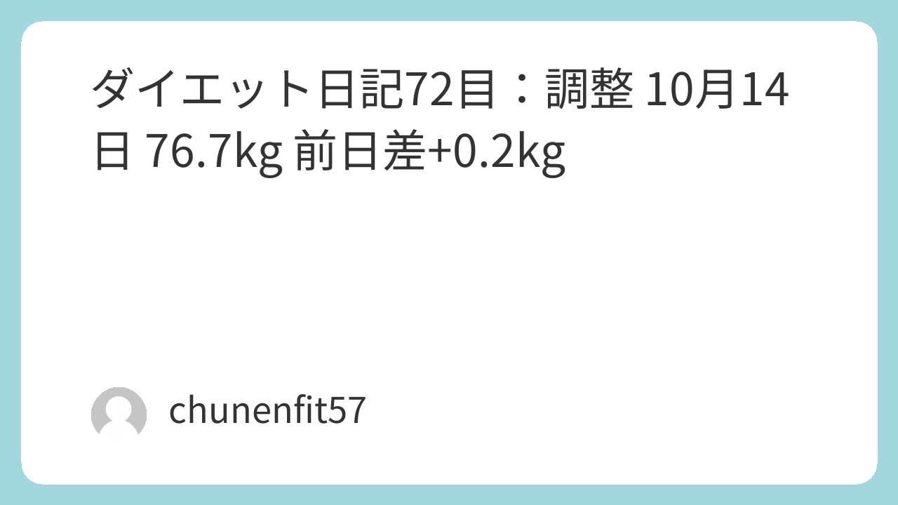 こんにちは、中年フィットおじさんです。57歳、独身、身長169cmで、8月5日からマンジャロを活用してダイエットに挑戦しています。72日目となる10月14日で、体重は76.7kgとなり、70日目(10月12日)の76.5kgから+0.2kgとなりました。記事は当日にまとめています。昨日は会食のため日記をお休みしましたが、今日から調整を再開した一日でした。目標は91.4kgから63kgへの減量ですが、ペースを見直しています。